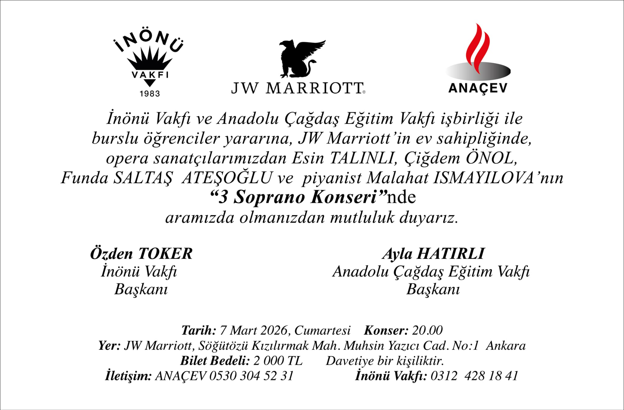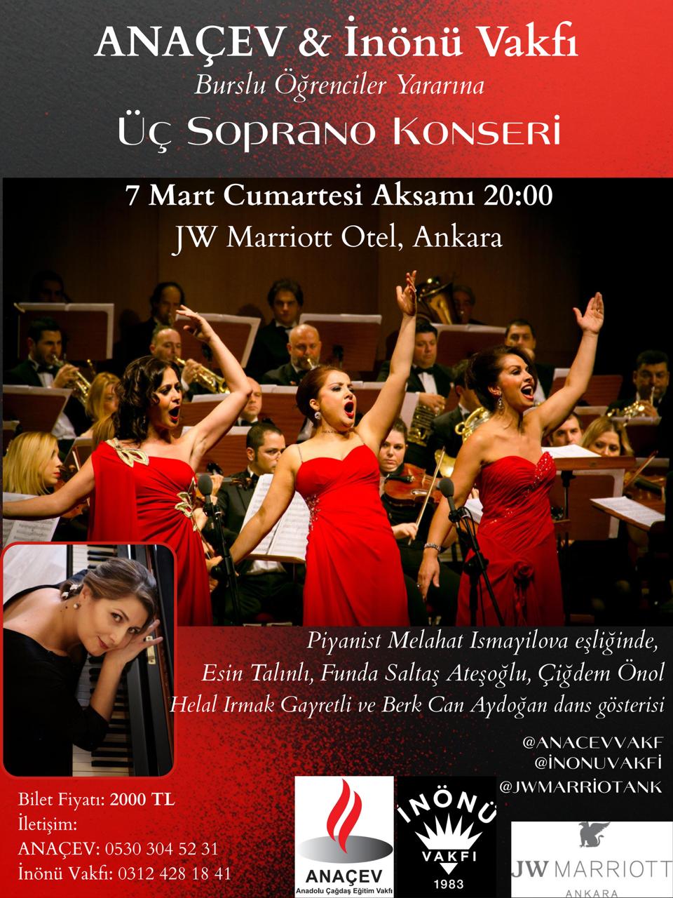 DUYURU: ANAÇEV & inönü Vakfi Burslu Ögrenciler Yararına ÜÇ SOPRANO KONSERİ - 7 Mart 2026 20:00 JW Marriott Otel, Ankara
